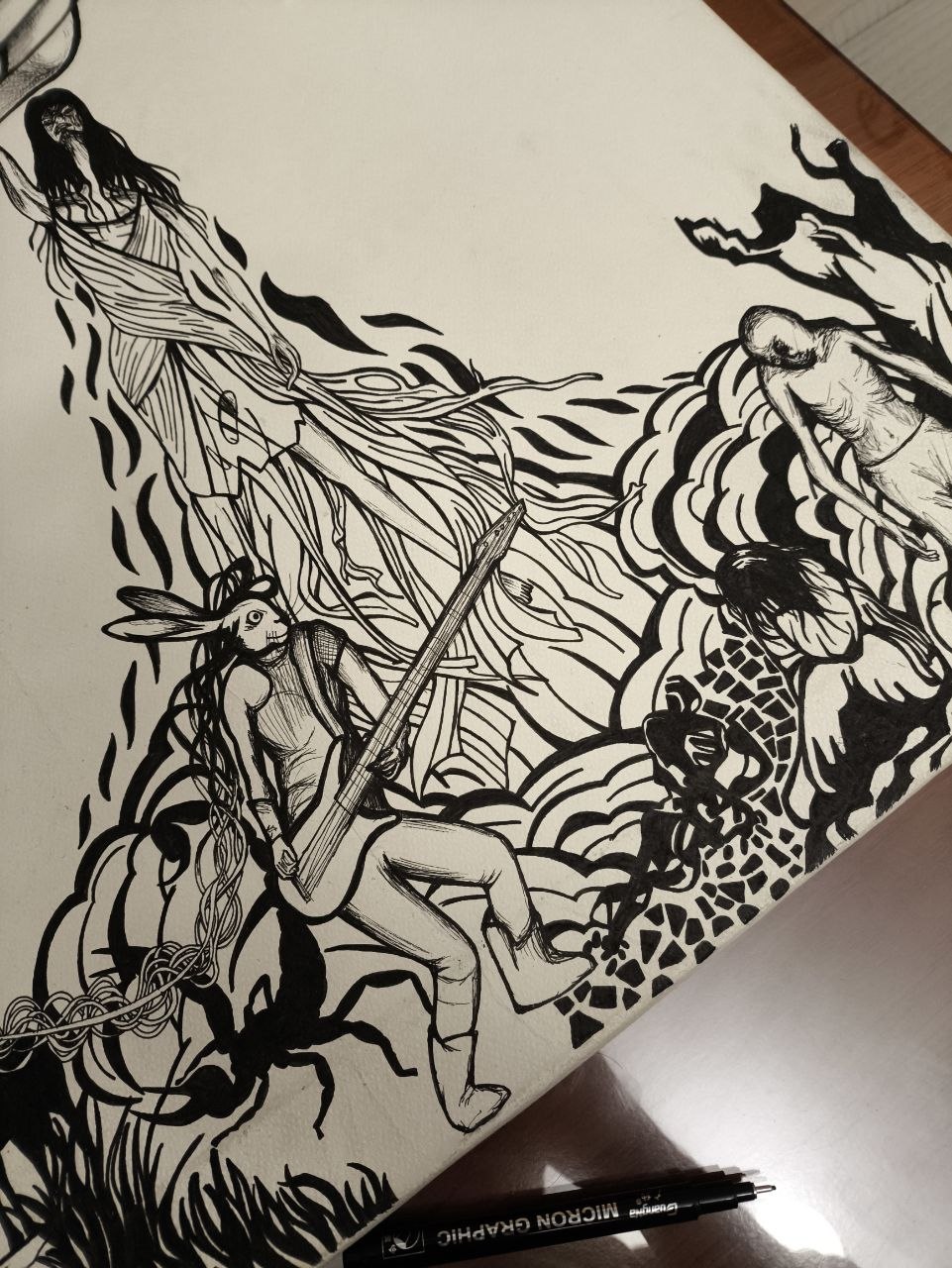 Me autoimpuse un reto extra, no conocer el tema del día siguiente hasta haber dibujado el del día anterior. Por lo tanto, tanto la composición como el tema general de la obra resultó de un complicado trabajo creativo.